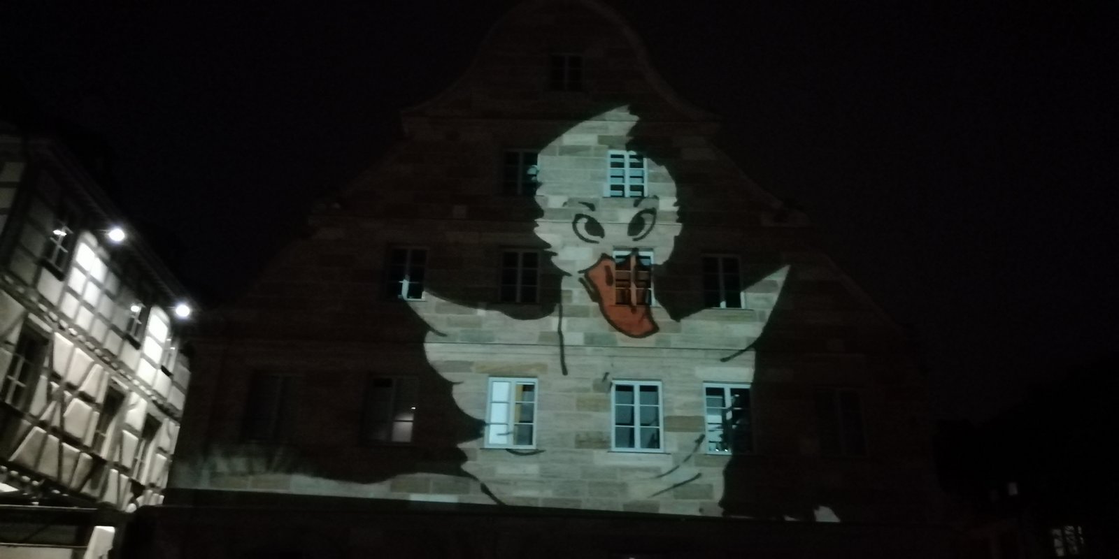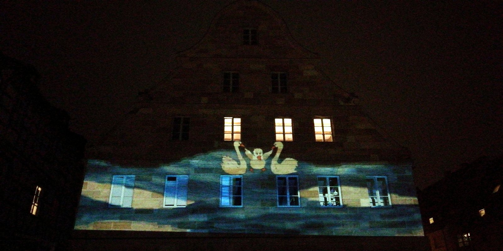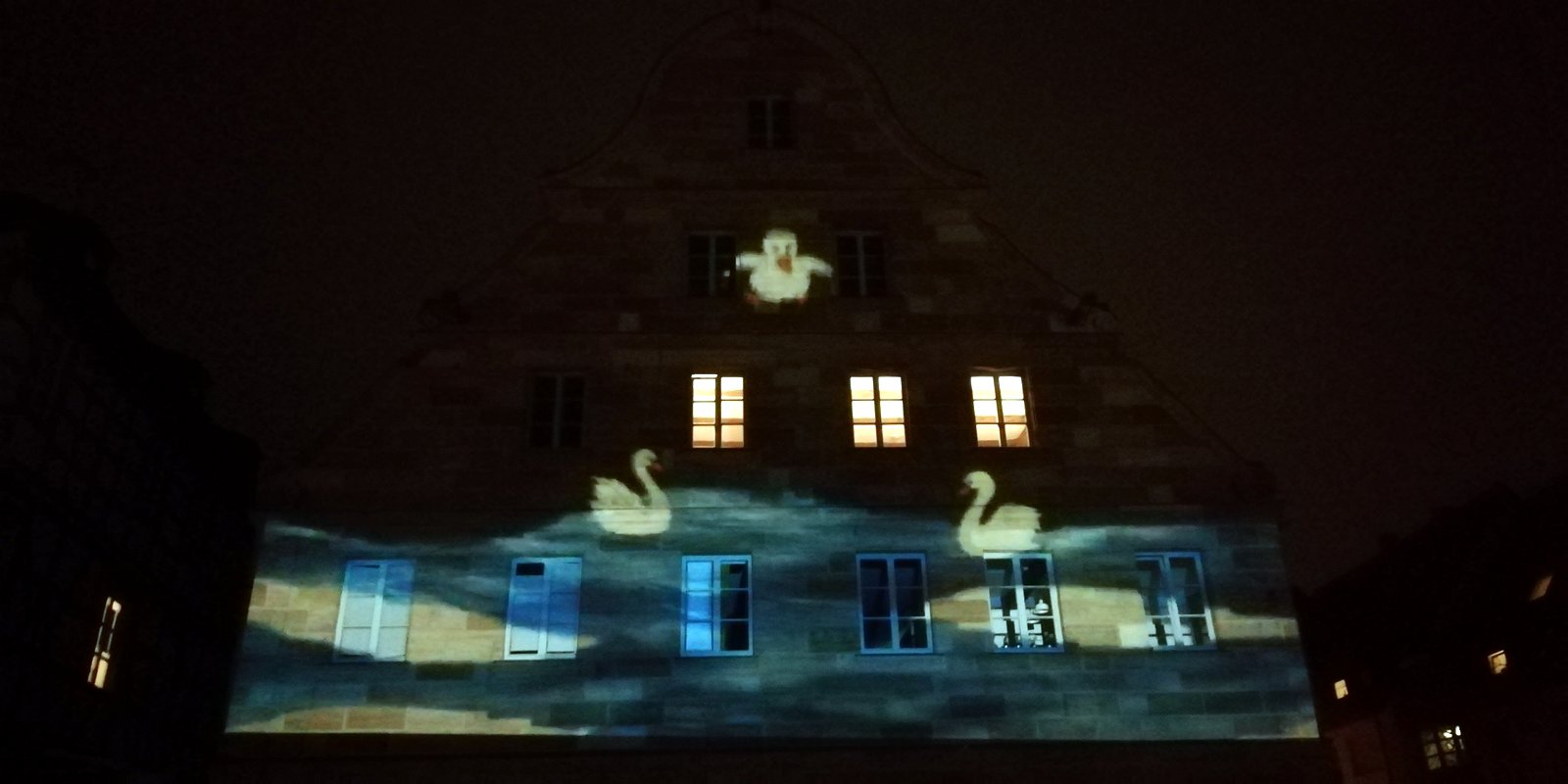 Eine dieser Video-Installationen wurde auf der Fassade des ehemaligen Gasthofs Goldener Schwan gezeigt. Der Goldene Schwan von 1681 ist eine der ältesten belegten Gastwirtschaften und eines der schönsten barocken Sandsteinhäuser der Stadt.