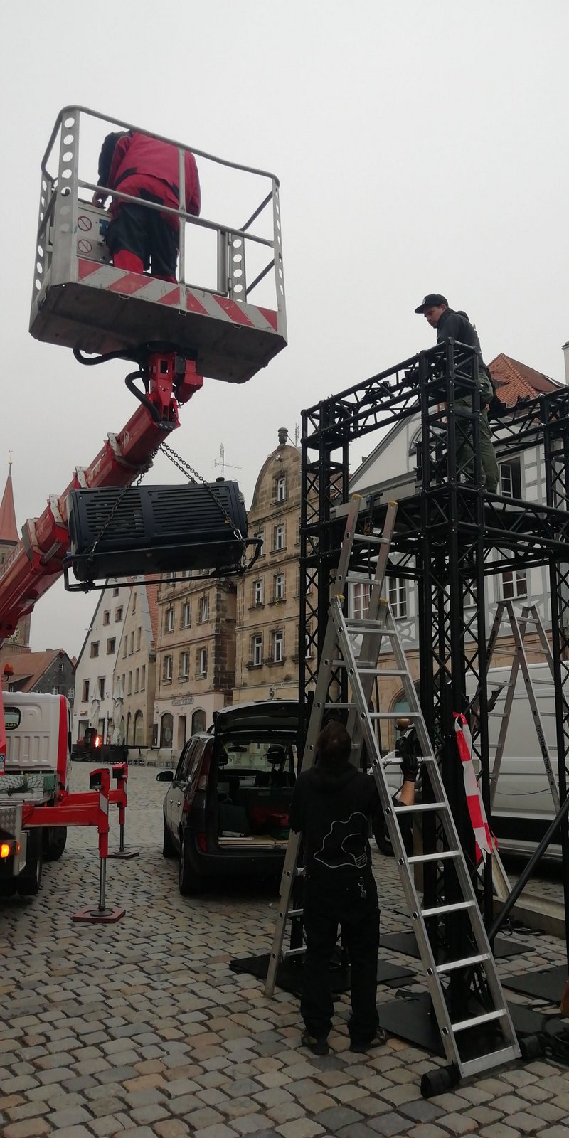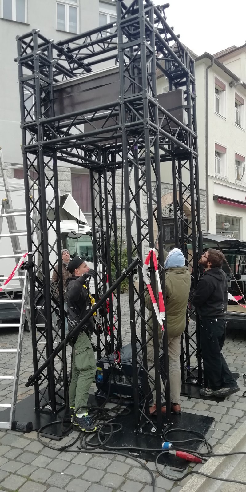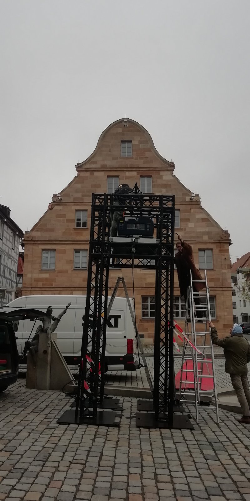 Eine dieser Video-Installationen wurde auf der Fassade des ehemaligen Gasthofs Goldener Schwan gezeigt. Der Goldene Schwan von 1681 ist eine der ältesten belegten Gastwirtschaften und eines der schönsten barocken Sandsteinhäuser der Stadt.