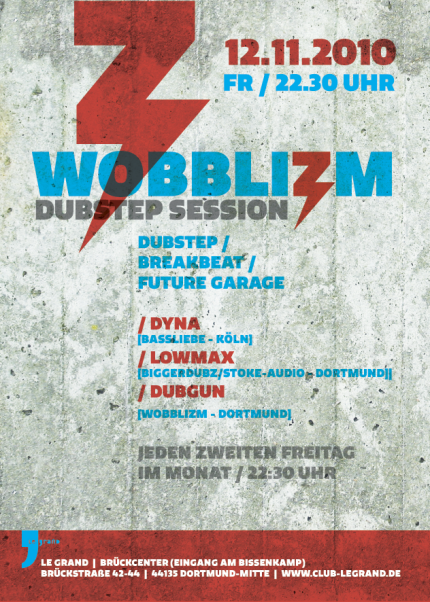 We Love Dubstep… dieser Ausspruch und das durchweg positive Feedback von Euch, lassen uns mit gutem Gewissen in die Zukunft schauen. Von Monat zu Monat können wir ständig steigende Besucherzahlen melden. Deshalb wird auch im November wieder der Tanzboden im Le Grand zum vibrieren gebracht! Dieses mal mit DYNA [Bassliebe – Köln], LOWmAX [Biggerdubz/Stoke-Audio – Dortmund] und natürlich Dubgun [Wobblizm – Dortmund]… Auf dem zweiten Floor werden euch abermals die Jungs von Remote Controlled Youth aus Münster ein Drum n Bass Set erster Güte liefern.