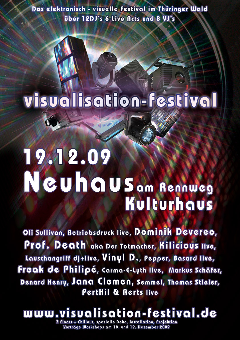 Vom 18. bis 20. Dezember findet im Kulturhaus in Neuhaus am Rennweg das „Visualisation-Festival“ statt. Diese Veranstaltung soll vorrangig VJ´s (Visualjockeys) die Möglichkeit geben sich in gemeinschaftlicher Runde zu treffen, Kontakte zu knüpfen, sich Inspirationen zu holen und sich über neue technische Innovationen zu informieren.