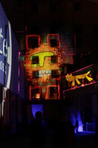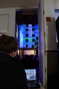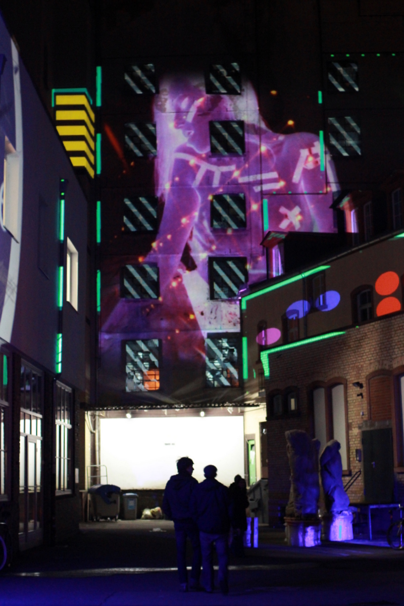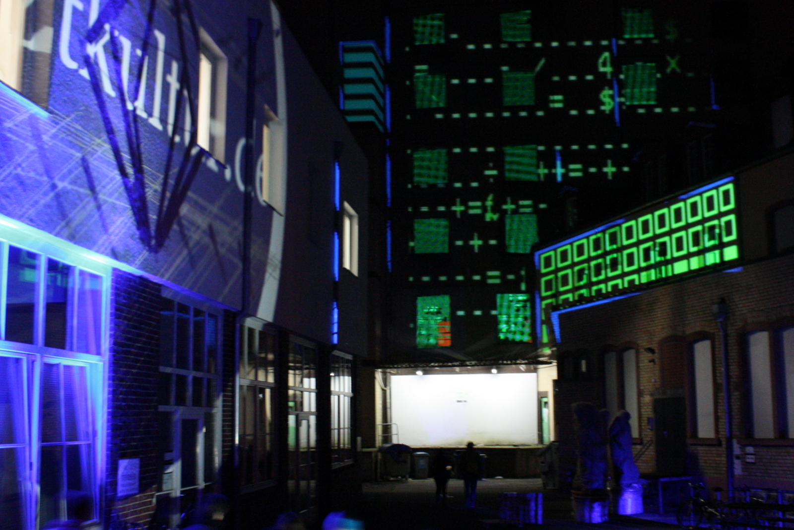 Ich bin nun seit Jahren Mitglied der VJCentral.de habe darüber Benjamin Jantzen kennengelernt und wäre gerne schon bei den ersten B-Seiten dabeigewesen. In diesem Jahr hat es geklappt und ich bin zusammen mit Christian Spieß von den LichtGestalten nach Mannheim gefahren. Einige bekannte Gestalten habe ich wiedergetroffen, Vargasz aus Ungern, Tim Vis, der sich als Mitorganisator vor allem um die Technik kümmert, Bonne Knibbe, die bei uns in Moers beim SHiny Toys schon einen Workshop gegegeben und in Mülheim ausgestellt hat, Thorsten E. und Roman Heller, die ich beim Space VJ Meeting letztes Jahr in Polen kennenlernen durfte, und zum ersten Mal habe ich Benjamin Jantzen (B-Seite) und Eva Bischof (4yourEye, Wien) in real live getroffen. Die restliche B-Seiten-Crew stellte sich ebenfalls als höchst liebenswürdig heraus: Ali, Nadine, Hysterica und der Mensch der mir vvvv in Reso näherbringen wollte ;) Keine vier Stunden nach unserer Ankunft – kaum dass es dunkel wurde – hingen wir dann auch schon am 15.000 Ansi Beamer und haben den Hinterhof gemappt, Christian mit seinem Tagtool und ich mit meinem Lappy. Ein netter visueller Battle, bei dem sich unsere verschiedenen Arbeitsweisen gut ergänzt haben, Handgezeichnetes gegen gemappte Videos :) Das wiederholen wir!