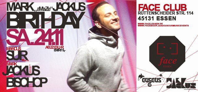 Ort des Geschehens ist diesmal der Face Club, eine kleine und intime Location im Herzen Rüttenscheids. Wer noch den ein oder andere CusCus Event in Erinnerung hat weiß, dass bei Mark Jackus Sets kein Fuß ruhig bleibt und ausgiebig bis in die Puppen gefeiert wird.