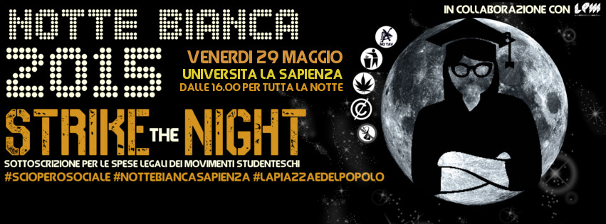 Thanks to the collaboration with the students of Sapienza University collectives, some of the workshops and panels are featured in dedicated areas of the University as the big final party which will takes place during La Notte Bianca della Sapienza, an open air festival fully selfmanaged and selffinanced by the students collectives of all the faculties which takes place in the streets and squares of the campus. After seven editions the festival has become a very important event which involves more than 15.000 people.