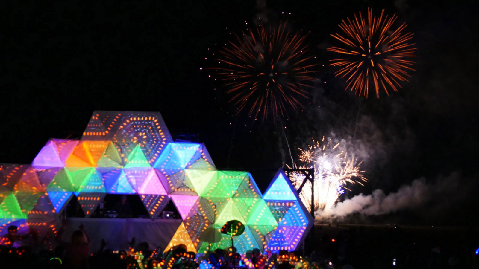 Gemeinsam mit der Essener MediMeisterschaften-Crew habe ich ein Bühnenkonzept für die Visuals auf der Essener entwickelt, das wir in den nächsten Jahren wiederverwenden und weiterspinnen könnnen. Es handelt sich im eine solide dreigliedrige Holzrahmenkonstruktion, etwa 10,50m breit und 4,90 hoch, die frontal an den Alutraversen einer Bühnen befestigt wird. Auf den Holzrahmen wurden gleichseitige Dreiecke angebracht, und zwar 93. Davon sind 51 echte Tetraeder, d.h. dreiseitige und gleichseitge Pyramiden. Bespielt wurde die Bühne mit zwei 12k ANSI Beamern, die etwa 12m entfernt standen.