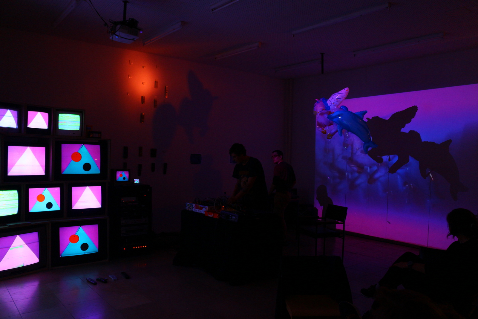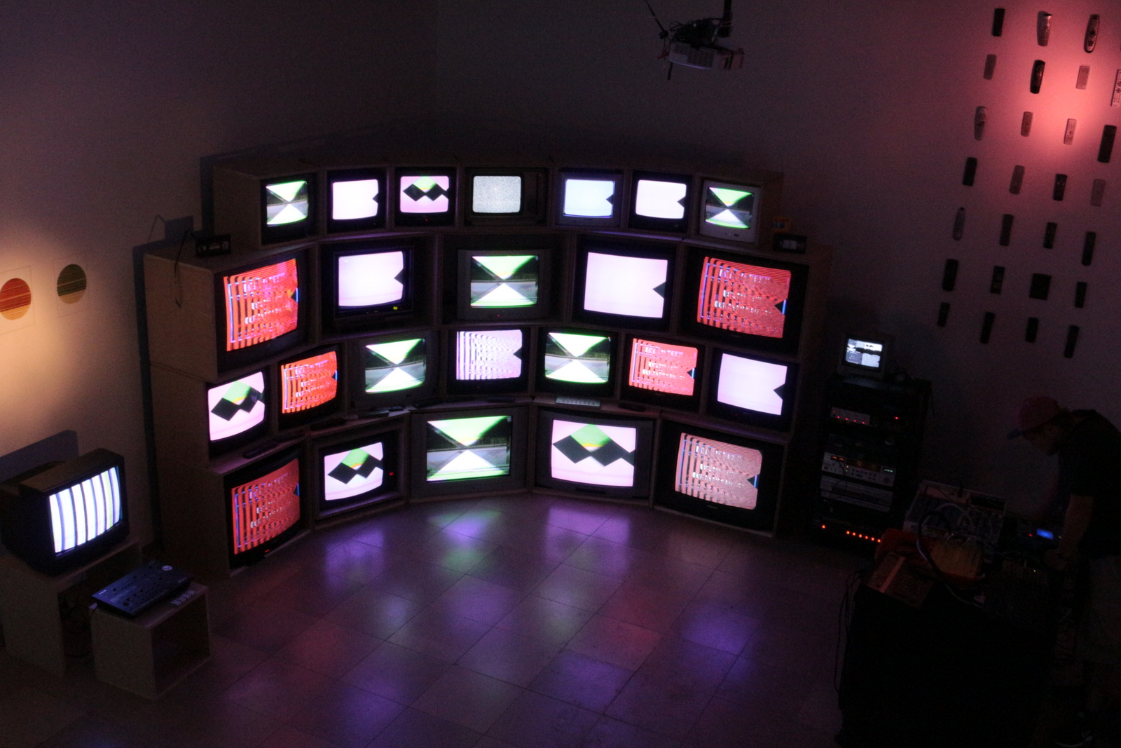 “ERROR TEKK – video wall” ist eine interaktive Videoinstallationen mit 24 Fernsehern. Durch Verkettung und Rückkopplung mehrerer, teilweise umgebauter Videoeffektgeräte wie Kameras, Mischpulte und Videoswitches entstehen auf Röhrenfernsehern und Beamer grafische Muster und Effekte. Stilistisch erinnern die Bilder an Rave, Noise und Zini, das Wuslon aus der Familie der Elektroiden – Signalstörungen und Glitches inklusive.